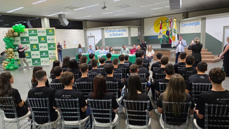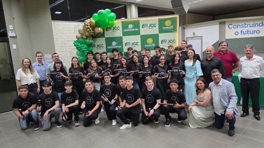 A noite da última quinta-feira, 27 de novembro, foi especial para 36 estudantes que concluíram o Programa Jovens Cooperativistas, desenvolvido pela Coopercocal em parceria com o SESCOOP/SC. A formatura aconteceu na sede social da cooperativa e reuniu familiares, instrutores, colaboradores e a diretoria. Depois de meses de aprendizagem, oficinas e vivências, os jovens receberam o certificado que marca o fim de uma jornada cheia de descobertas.
